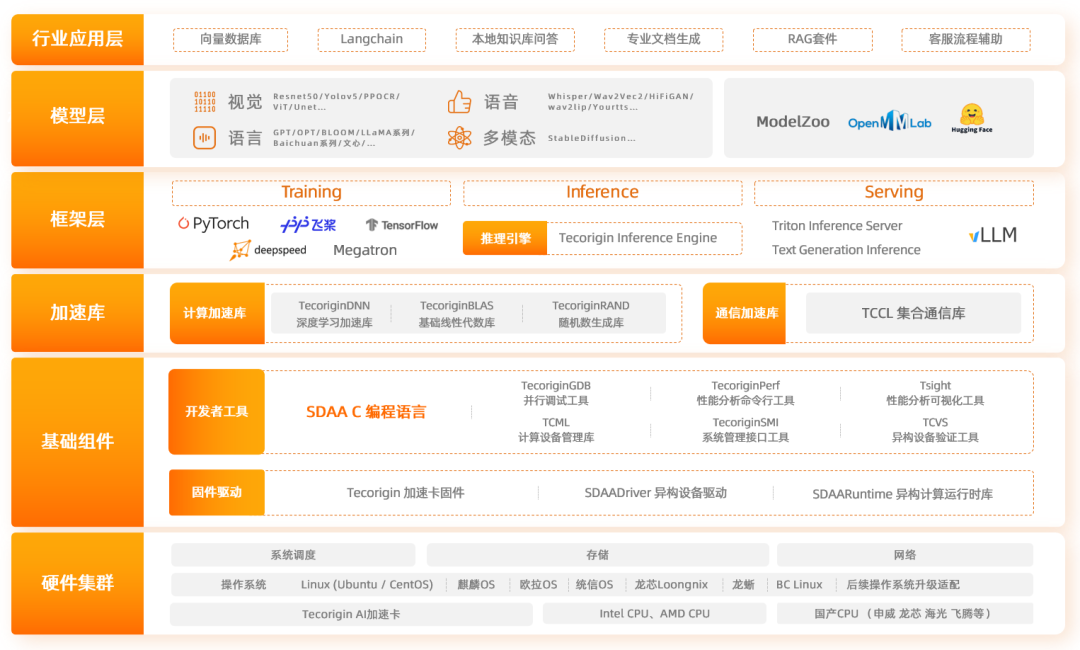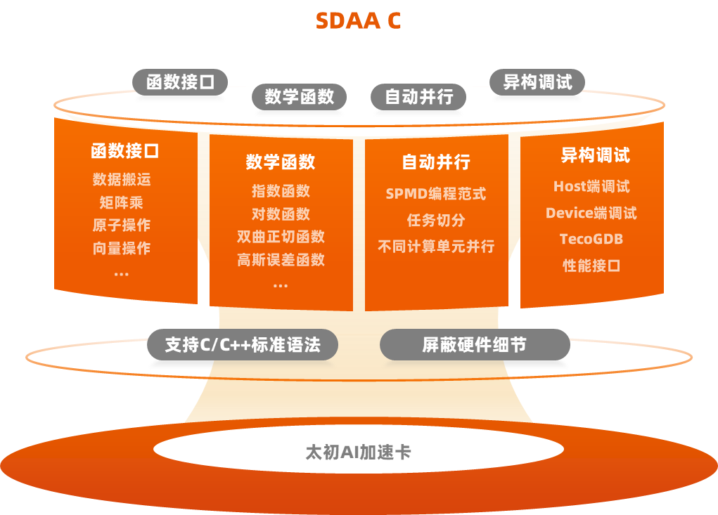 SDAA C運行于基礎組件層,對下屏蔽了硬件的物理特性,對上提供了豐富的編程接口,以及代碼調(diào)試、調(diào)優(yōu)工具。無需感知底層的硬件細節(jié),僅需遵從SDAA C的規(guī)范即可使用太初AI加速卡,為高并發(fā)、大數(shù)據(jù)運算提供強有力的算力支撐。