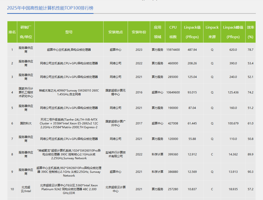 近日,在第七屆中國(guó)超級(jí)算力大會(huì)(ChinaSC 2025)上,《2025中國(guó)高性能計(jì)算機(jī)性能TOP100排行榜》正式揭曉。榜單顯示,由某服務(wù)器供應(yīng)商研制、2023年部署于某超算中心的主機(jī)系統(tǒng)仍居榜首,測(cè)試性能達(dá)487.94 PFLOPS(約48.79億億次每秒),“神威·太湖之光”和“天河二號(hào)” 依然穩(wěn)居第四和第六位。