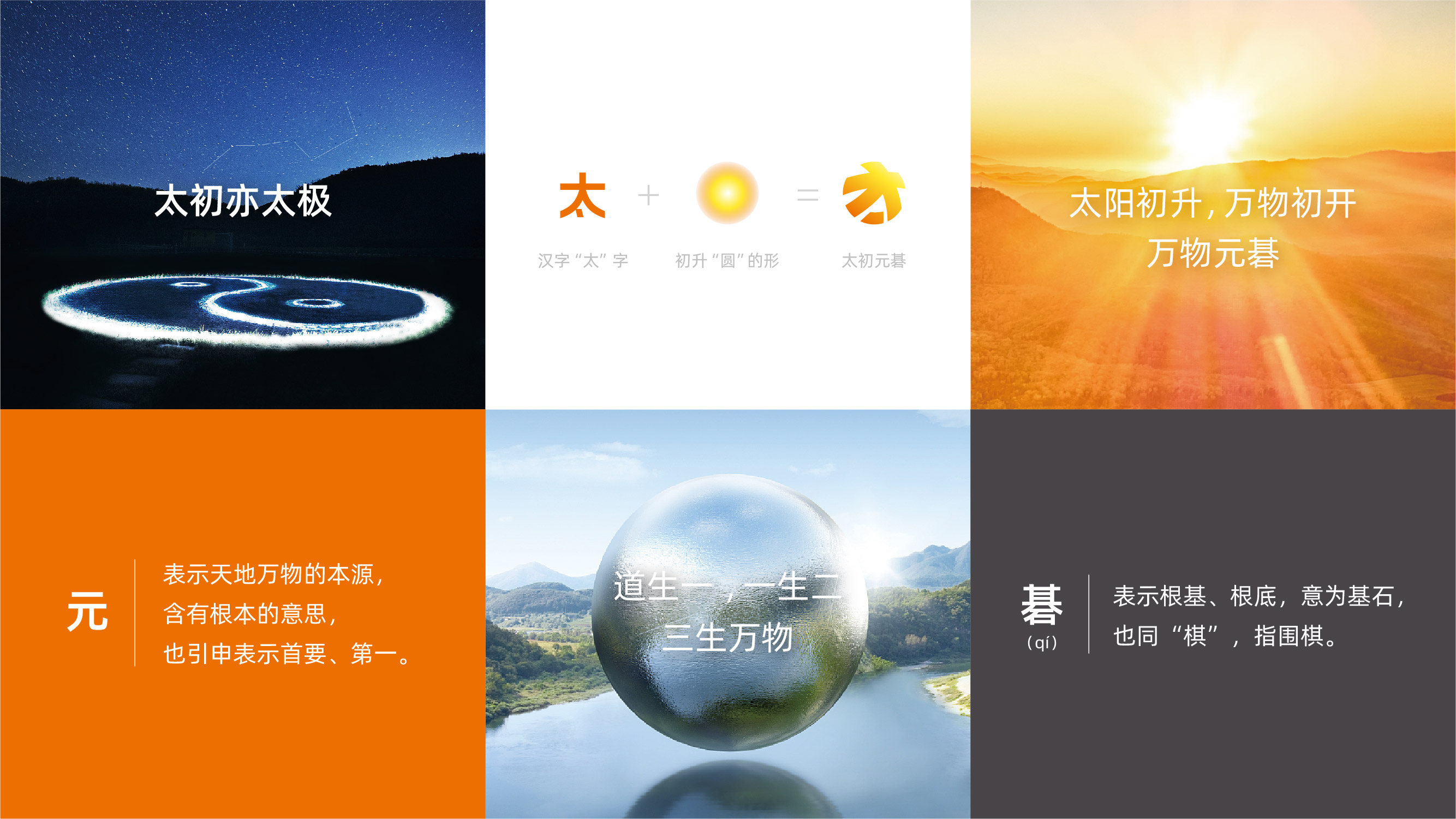 道生一,一生二,三生萬物——我們從中提取一個初始的“圓”形,并結(jié)合漢字“太”字,通過獨(dú)特的組合方式,創(chuàng)作出了一個如日初升,朝氣蓬勃的形象。