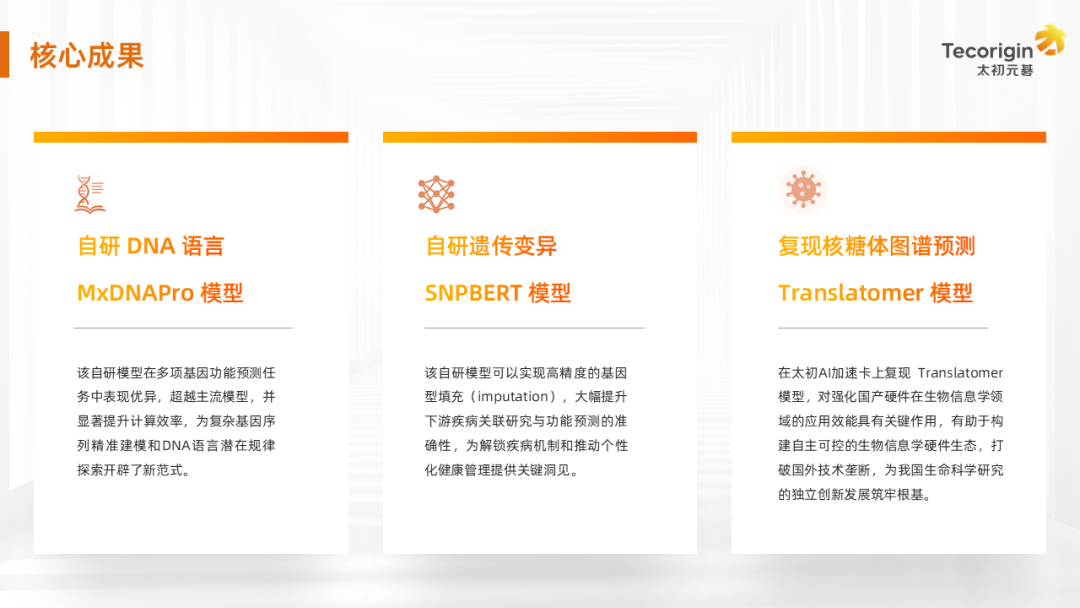 湖南大學(xué)生物學(xué)院計(jì)算基因組學(xué)課題組的羅宵教授帶領(lǐng)團(tuán)隊(duì)與太初元碁開(kāi)展深度合作,強(qiáng)化國(guó)產(chǎn)AI算力在生物信息學(xué)領(lǐng)域的應(yīng)用效能,推動(dòng)構(gòu)建自主可控的生物信息學(xué)硬件生態(tài),打破國(guó)外技術(shù)壟斷,為我國(guó)生命科學(xué)研究的獨(dú)立創(chuàng)新發(fā)展筑牢根基: