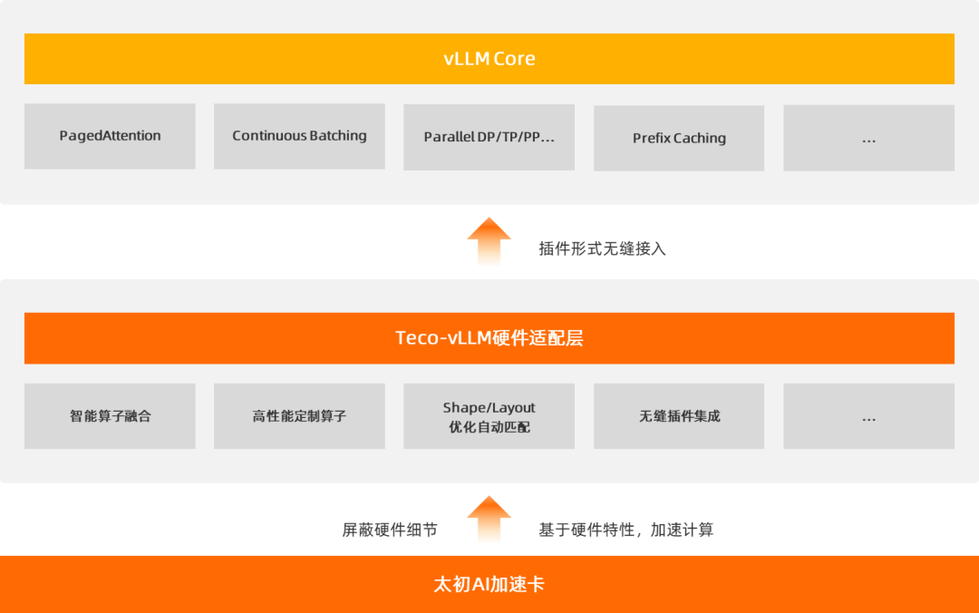 Teco-vLLM作為深度適配太初AI加速卡的高性能大模型推理框架,不僅無(wú)縫兼容vLLM生態(tài),零成本遷移模型;還通過(guò)智能算子融合、硬件級(jí)動(dòng)態(tài)優(yōu)化等核心技術(shù),顯著提升模型的推理效率,為開(kāi)發(fā)高并發(fā)、低延遲的智能應(yīng)用打下堅(jiān)實(shí)基礎(chǔ)。開(kāi)發(fā)者無(wú)需深入硬件細(xì)節(jié),即可輕松使用太初AI加速卡的強(qiáng)大推理能力。